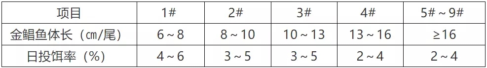 «根据网箱或存池金鲳鱼规格及数量,参考投饵参考表中推算投饵量,再根据天气、水温、水质、金鲳鱼摄食及健康状况等予以适当调整。